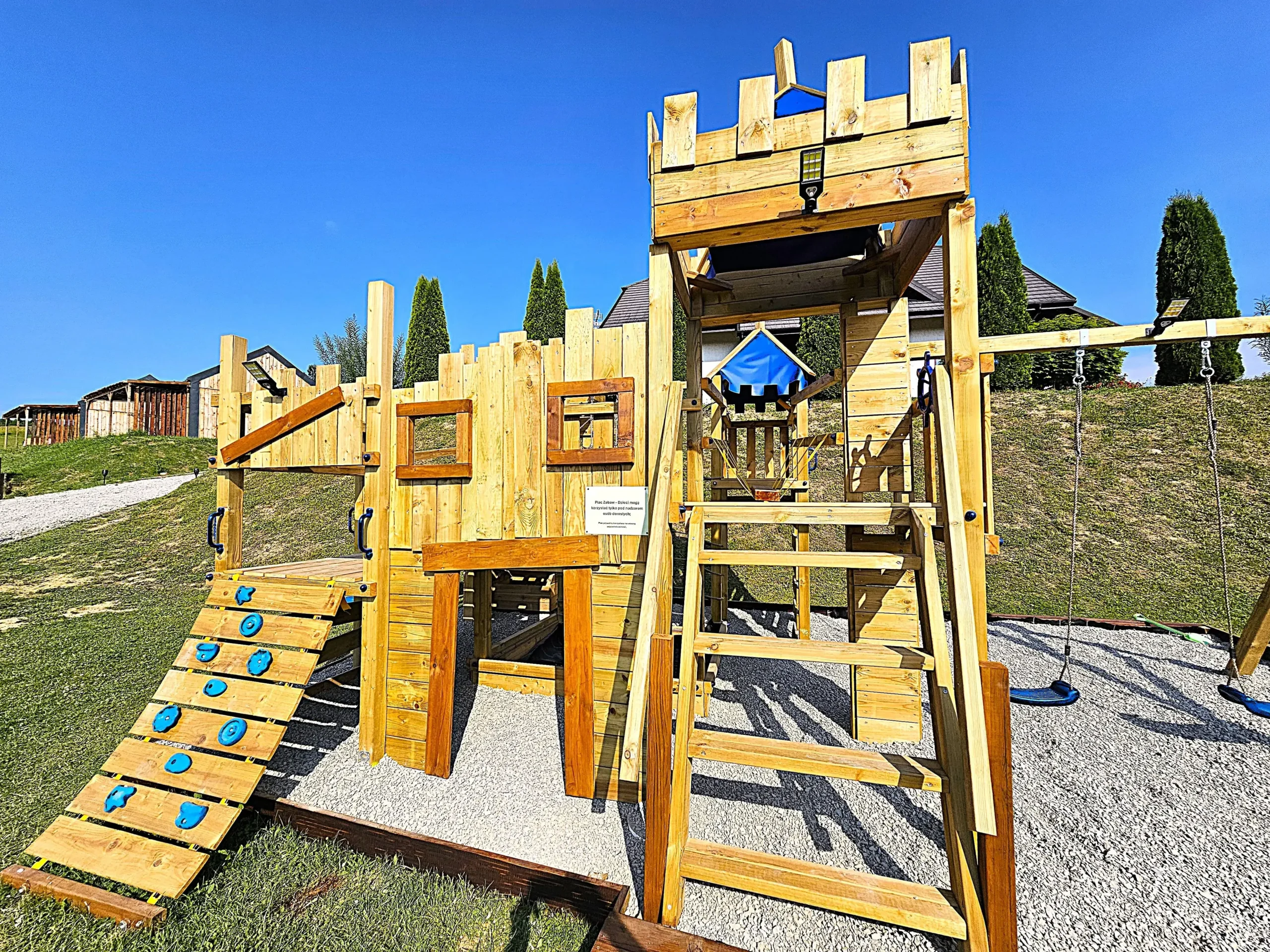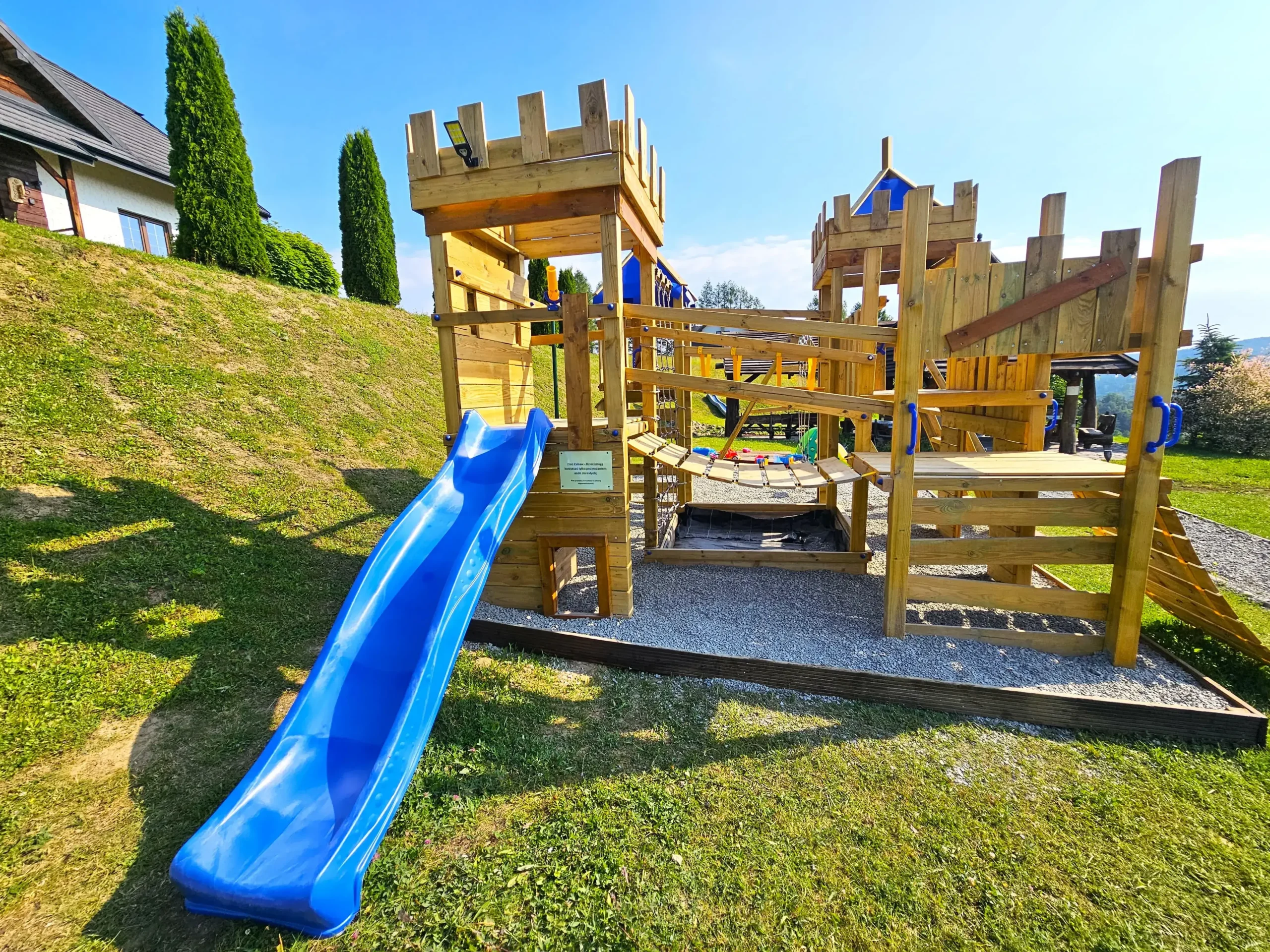 Zbójnicki domek, huśtawki, piaskownica, zjeżdżalnia