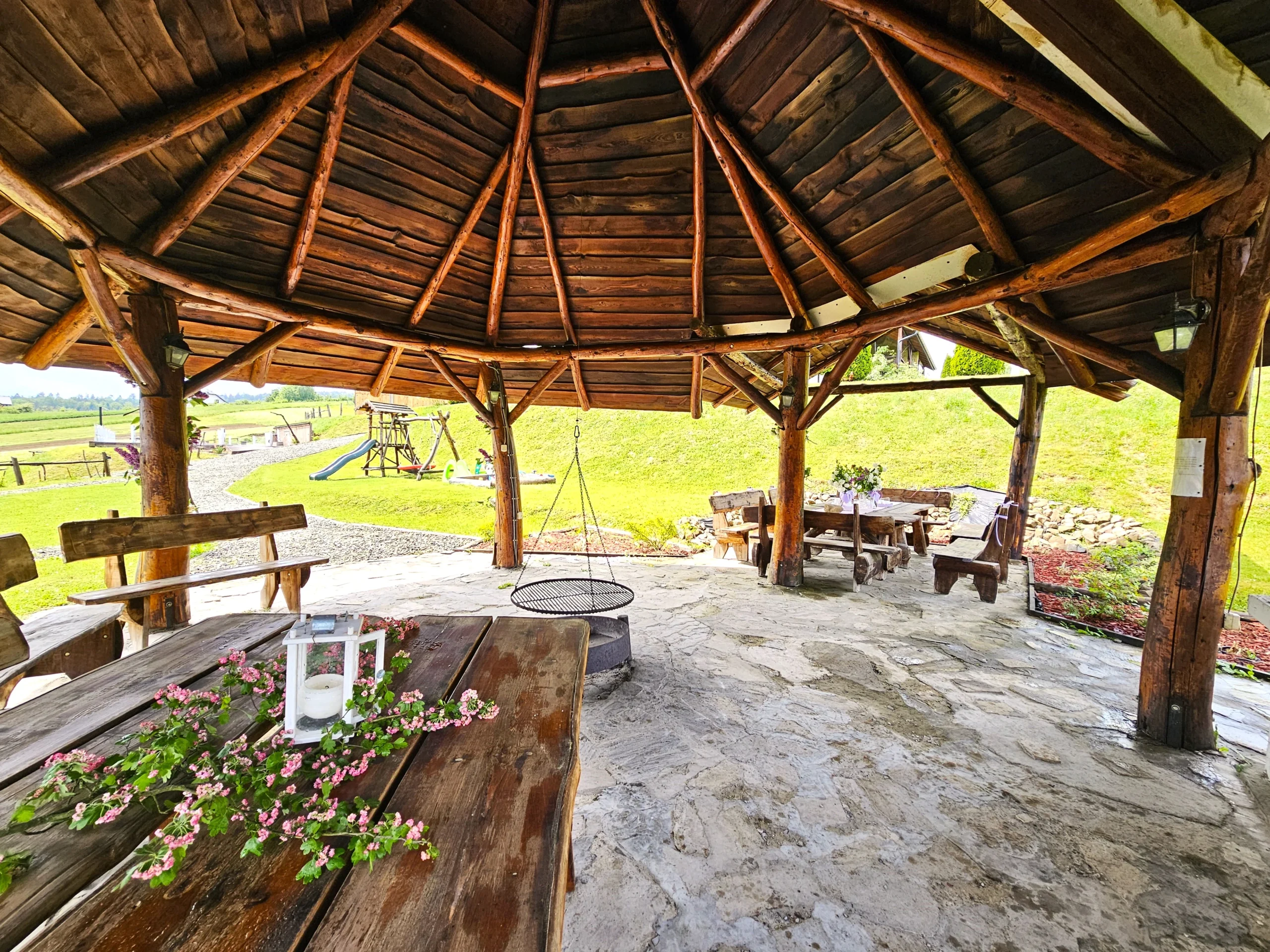 W którym znajduje się modrzewiowa chata grillowa, basen, hamakowe pole, plac zabaw dla dzieci ze zbójnickim domkiem, zjeżdżalniami, huśtawkami, trampolinami, piaskownicą i hulajnogami.